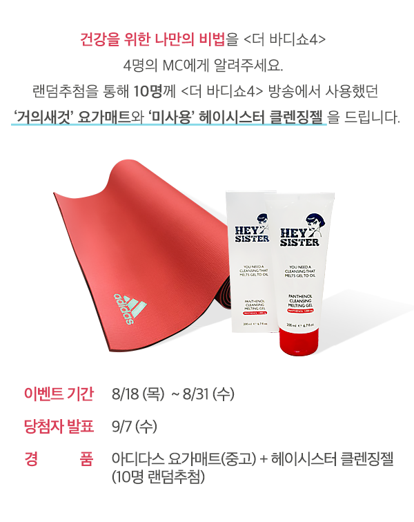 응모해주신 회원님중 10명을 랜덤추첨해서 <더 바디쇼4> 방송에서 사용한 아디다스 요가매트(거의새것 중고)와 클렌징젤(미사용)을 드릴게요~!!