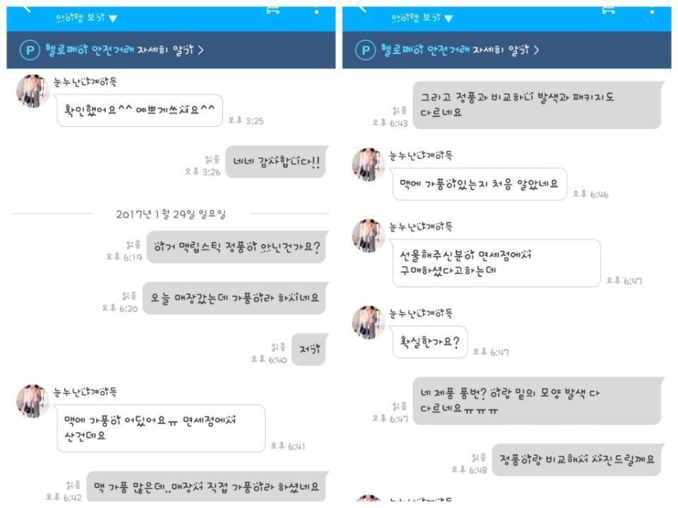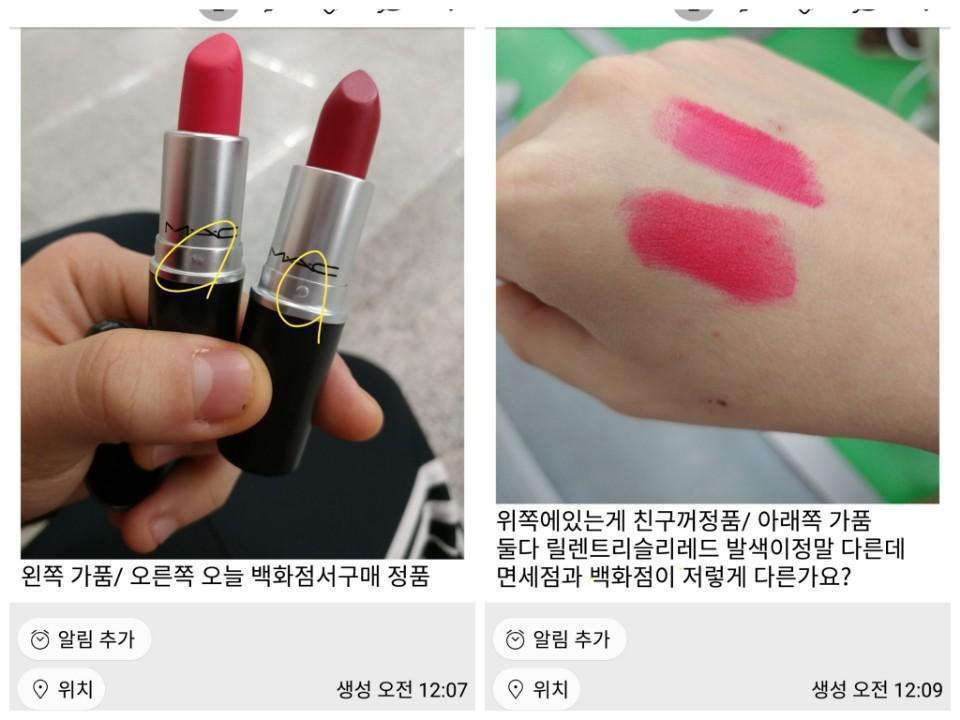 그리고 매장에 가서 확인했으니 가품인것이 확실한데 제가 오늘 직접 친구것과 같은 맥립스틱 색상과 백화점에서 직접 비교해 봤는데 디자인과 뚜껑 발색자체가 달라서 비교영상까지도 보냈습니다 그런데 계속 당당하게 따지네요 이러는 사람 첨봤습니다 애초에 가품이라는걸 밝히고 판매하시던가 정말 답이없네요