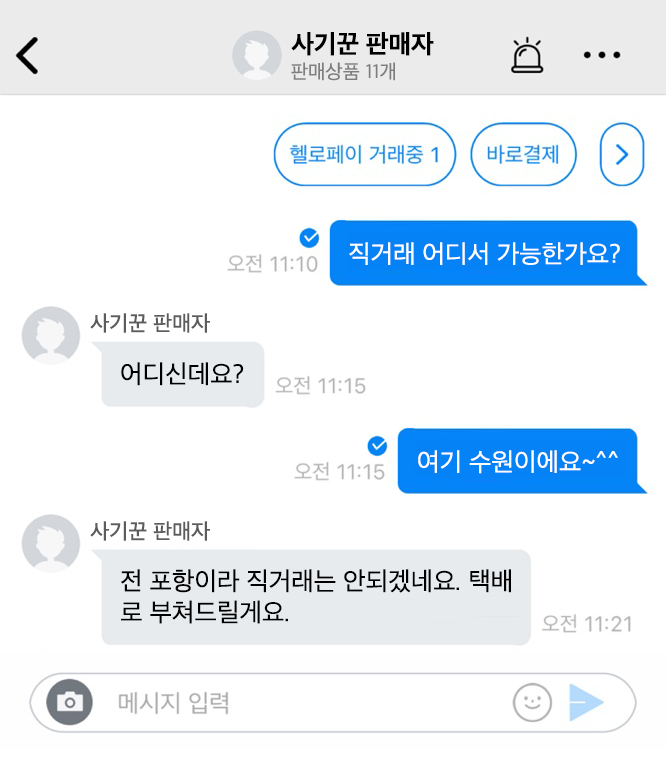 직거래 가능하냐고 물어보면 사기꾼들은 자기 지역을 먼저 공개하지 않고 구매자의 지역부터 물어봄. 구매자의 지역과 겹쳐 직거래가 가능한 상황을 만들어내지 않기 위한 전략.