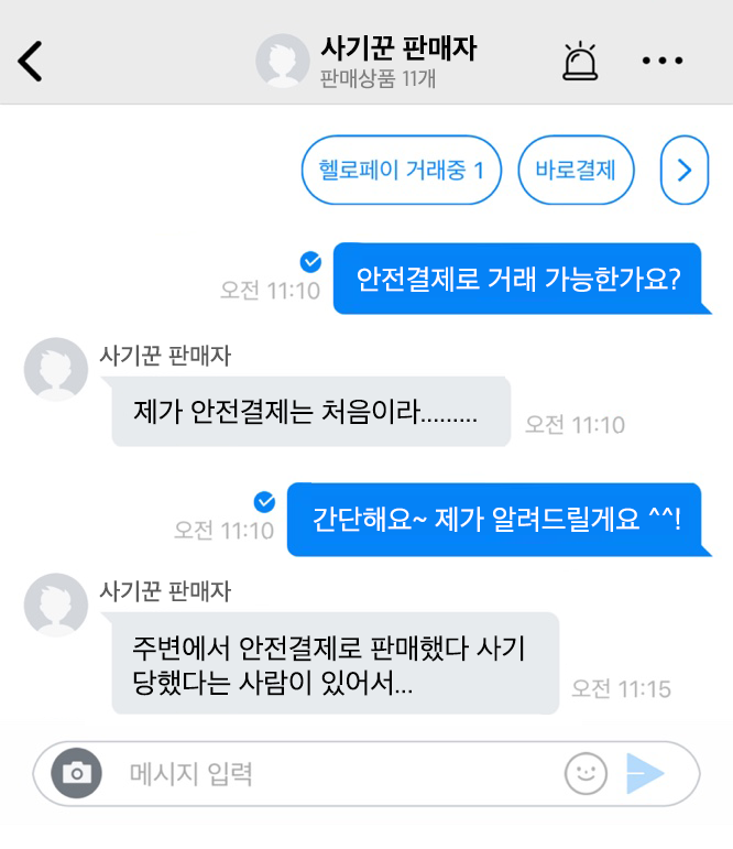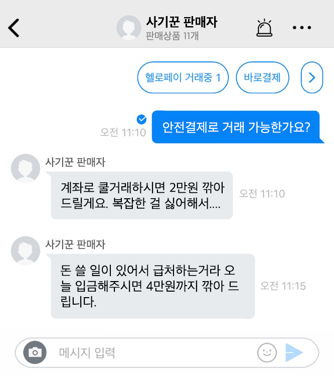 안전결제 하자고 하면 ‘그런거 모른다’, ‘안전결제 했다가 사기당했다’, ‘입금이 늦다’ 등의 이유로 회피하는 경우가 있음.