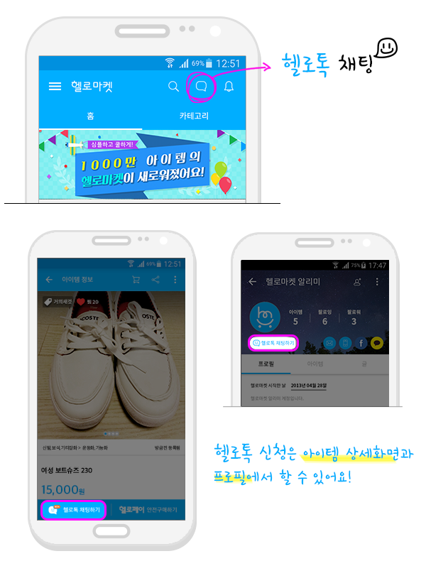 + 현재 헬로톡은 안드로이드에서만 가능합니다. 아이폰에서도 곧 헬로톡을 만나실수 있어요 :) 아이폰도 곧 예쁜 옷 입고 인사드릴 예정이에요!조금만 기다려 주세요~ 듀근듀근 :-)